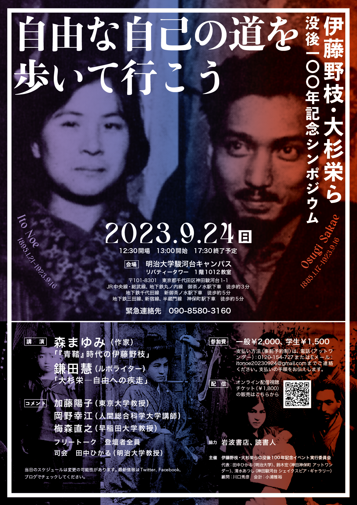このイベントは「伊藤野枝・大杉栄らの没後100年記念イベント」の一環として行なう、「分科会1」になります。引続き同じ会場で、「分科会2」として「労働争議と弾圧の推移と現在」が別途開催されます。両方の分科会にご参加いただければ幸いです。