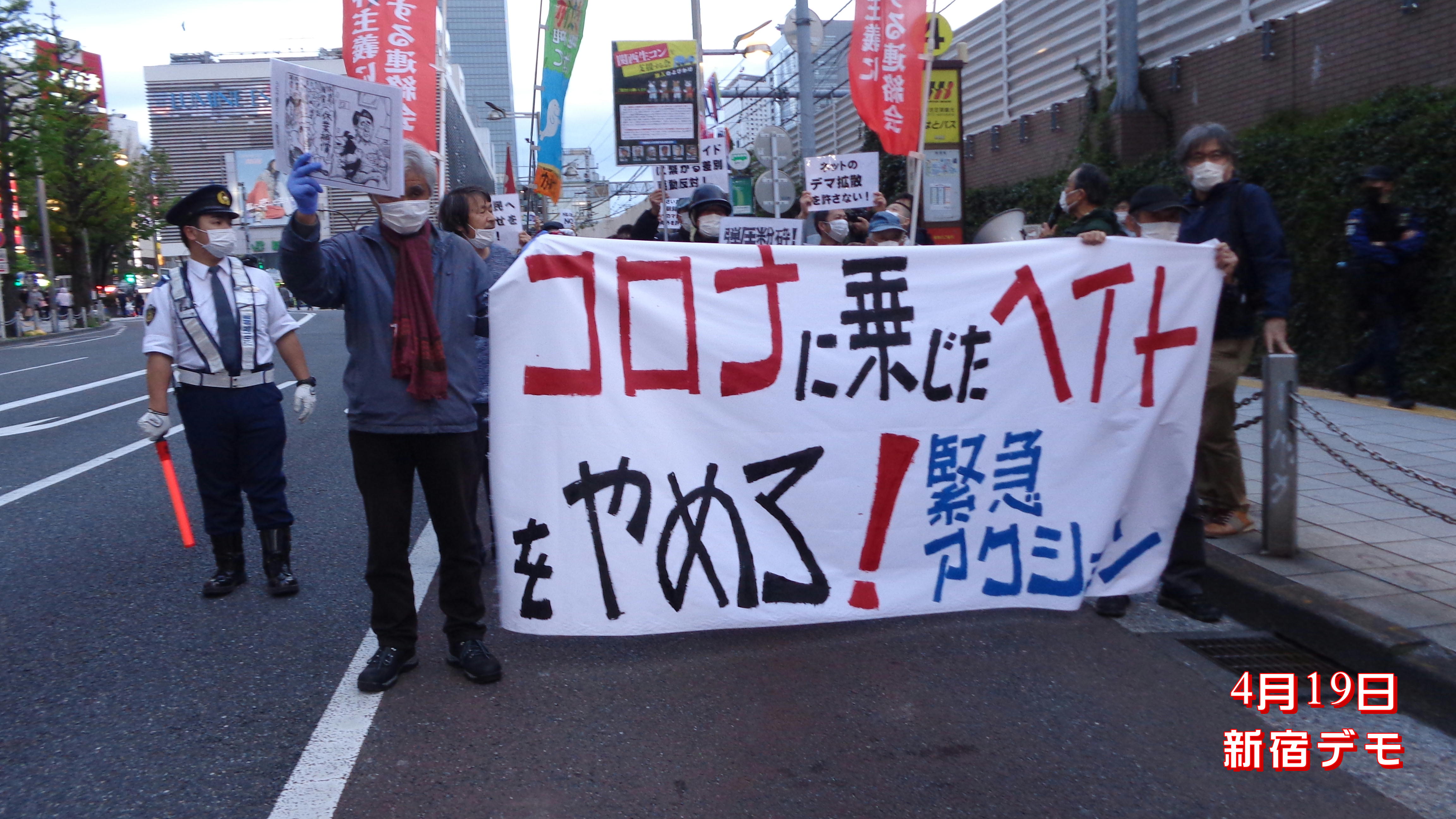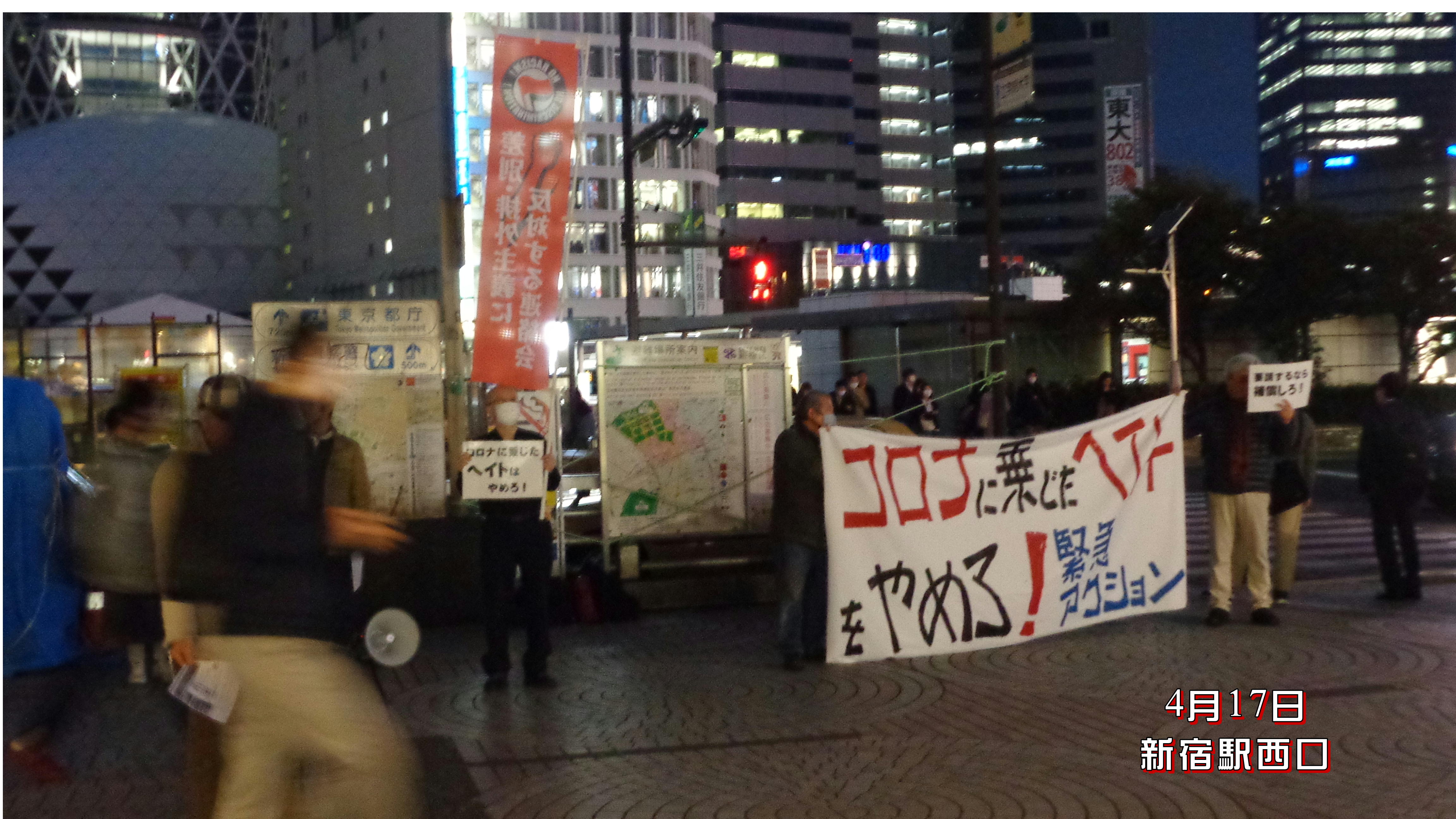 「一人ひとりが接触者を8割減らす」という考え方に基づいた緊急事態宣言の下で、市民の外出や経済活動が「自粛」に追い込まれました。市民は不要不急の外出はしないように求められ、街の商店は店を開かないように圧力をかけられ、事業を停止した企業から多くの労働者が解雇されています。「自粛」しない商店・事業所に対して嫌がらせをする「自粛警察」まで現れて、多くの人々の日常生活が破壊されたのです。新型コロナウイルスの感染予防を大義名分に掲げた緊急事態宣言と「自粛」強要が、地域における監視と密告を横行させました。さらにそれが差別と分断を生み出し、特に外国人に対しては排外主義の激化として襲いかかっている現状に対して、標記の緊急行動を組みました。