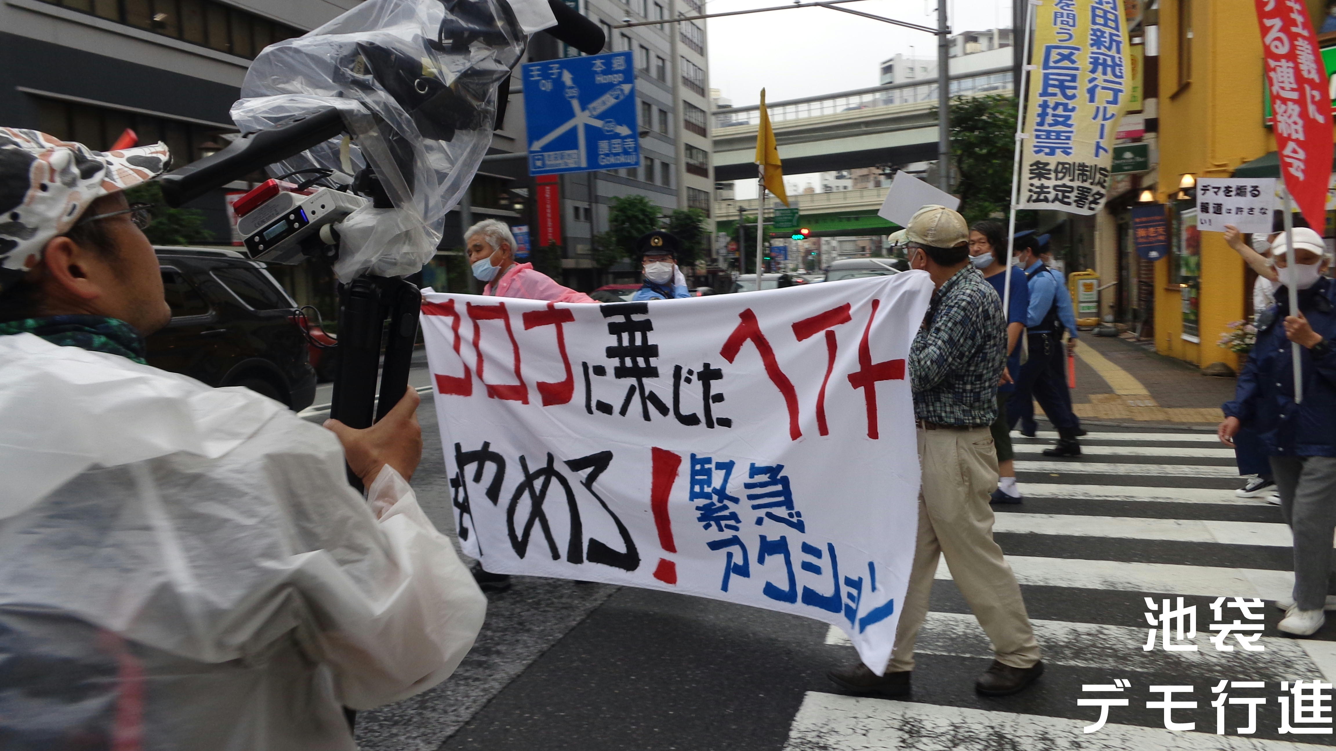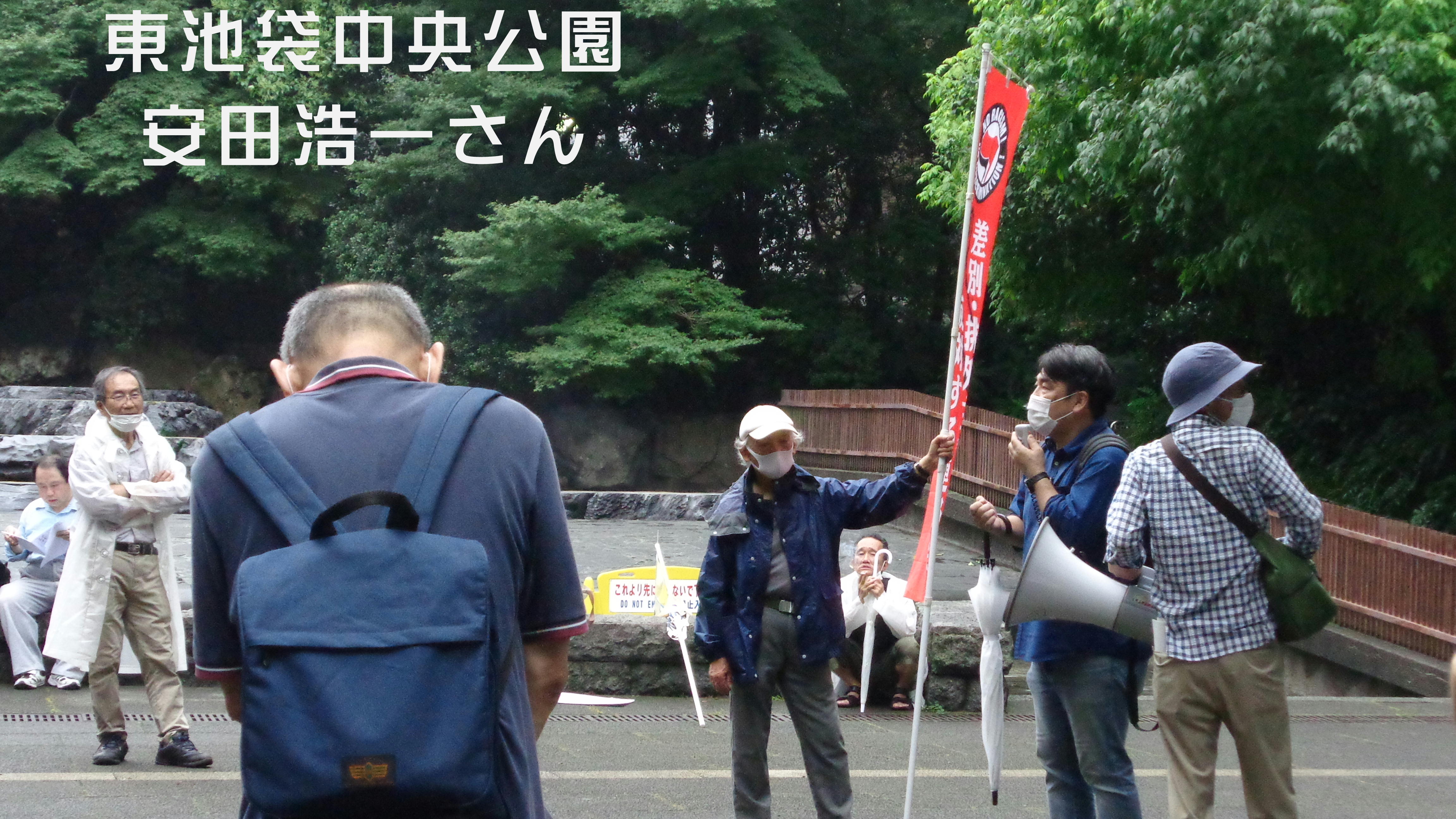 この日は、14:30~15:00の池袋東口駅前広場での事前情宣と15:30からの集会・デモの2部構成でした。雨模様の天気の中を駆けつけて下さった7団体の方から発言を受けました。各地域・各課題で取り組みを重ねている皆さんですが、それぞれのお話からは緊急事態宣言(さらには改憲で導入がもくろまれている緊急事態条項)が差別と排外主義を強めるものであることがよくわかりました。(発言団体は五十音順に、「沖縄への偏見をあおる放送をゆるさない市民有志」「『高校無償化』からの朝鮮学校排除に反対する連絡会」「集会・デモくらい自由にやらせろ!実行委員会」「争議団連絡会議」「たんぽぽ舎」「反戦実行委員会」「ヘイトスピーチを許さない・練馬」です)